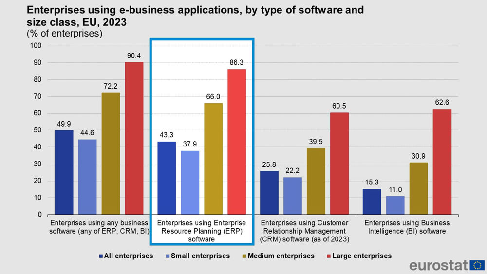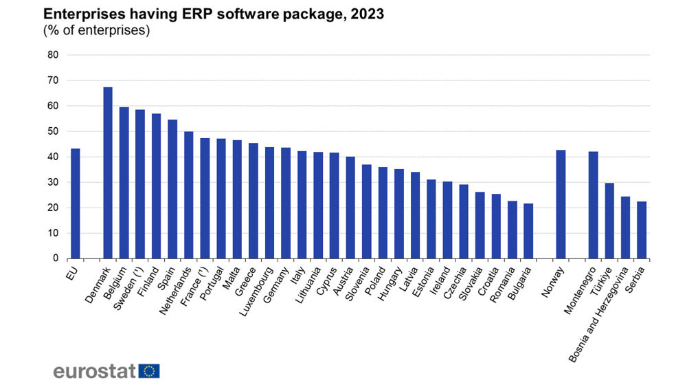 EUROSTAT opublikował dane za 2023 r. dotyczące poziomu cyfryzacji europejskich przedsiębiorstw, w oparciu o wyniki ankiety "EU survey on ICT usage and e-commerce in enterprises". Statystyki uzyskano dzięki badaniom przeprowadzonym przez krajowe urzędy statystyczne. Wśród danych znalazło się również miejsce dla systemów ERP.